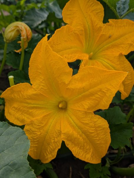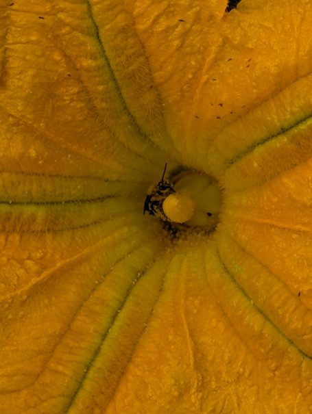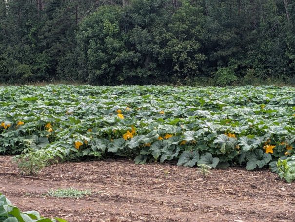 July 14 - In the fields, green has taken over! The pumpkins and squash are flowering, and we can hear the bees? buzzing around. And the sweet corn is almost as tall as we are.