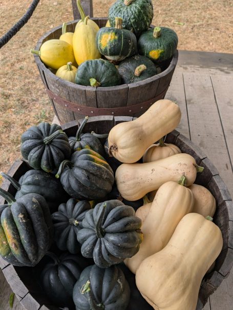SQUASH... We have 5 different kinds of squash ready: Buttercup, Spaghetti, Acorn, Delicata, Butternut (limited supply for now as they are still ripening).