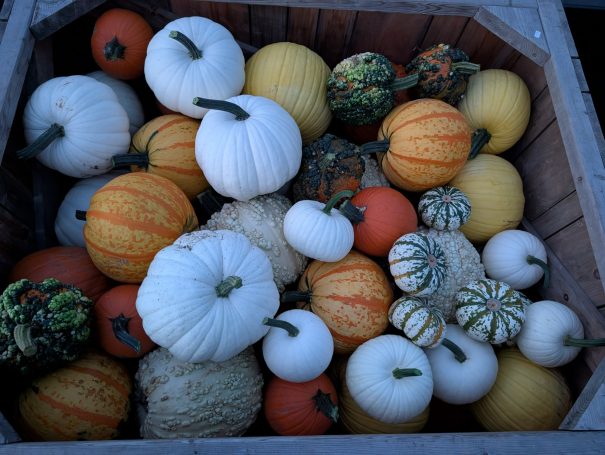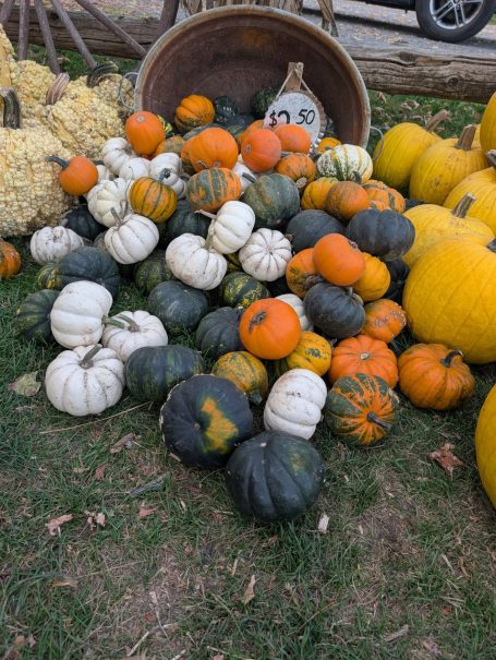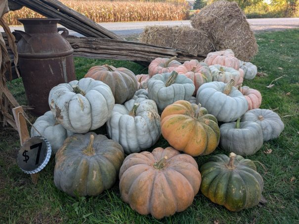 We still have lots of colored pumpkins, straw bales, gourds, and pie pumpkins, too.