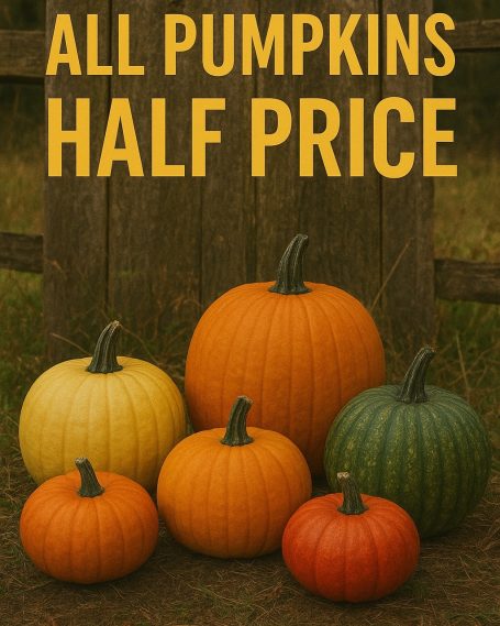 October 25 - From now until the end of the season, all pumpkins will be half price! If you haven't found that perfect jack-o-lantern pumpkin yet, now is the time!